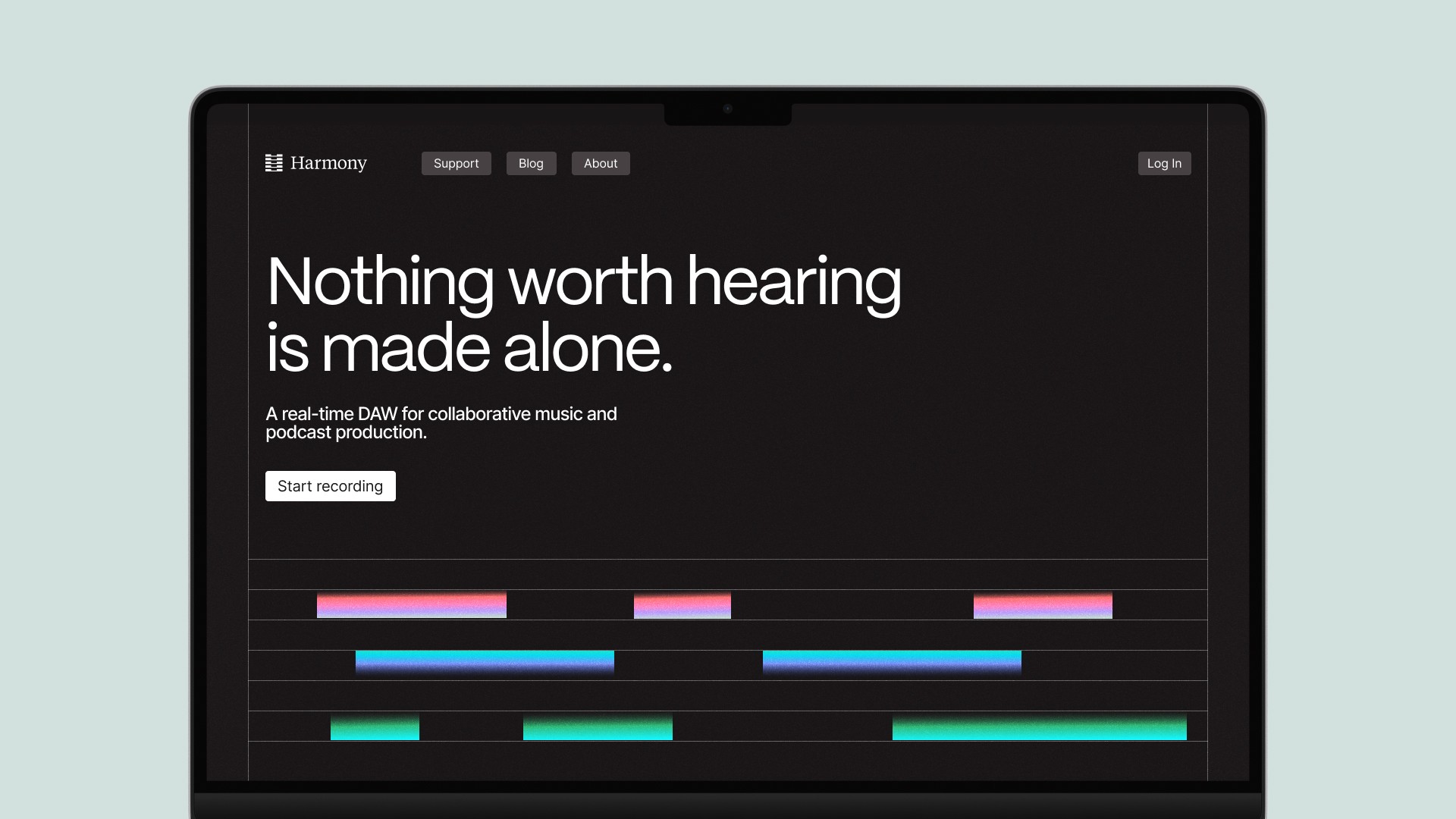 Brand & Web Design for Harmony a collaborative, browser-based DAW for recording, editing, and mixing in real time.